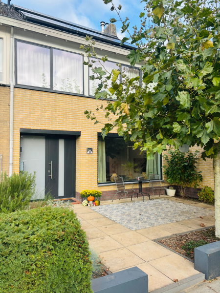 De achtertuin is bereikbaar via de keuken en biedt ruimte voor een terras en beplanting. Aan de voorzijde geniet u van het vrije uitzicht op het groen, wat zorgt voor een rustige en natuurlijke sfeer.